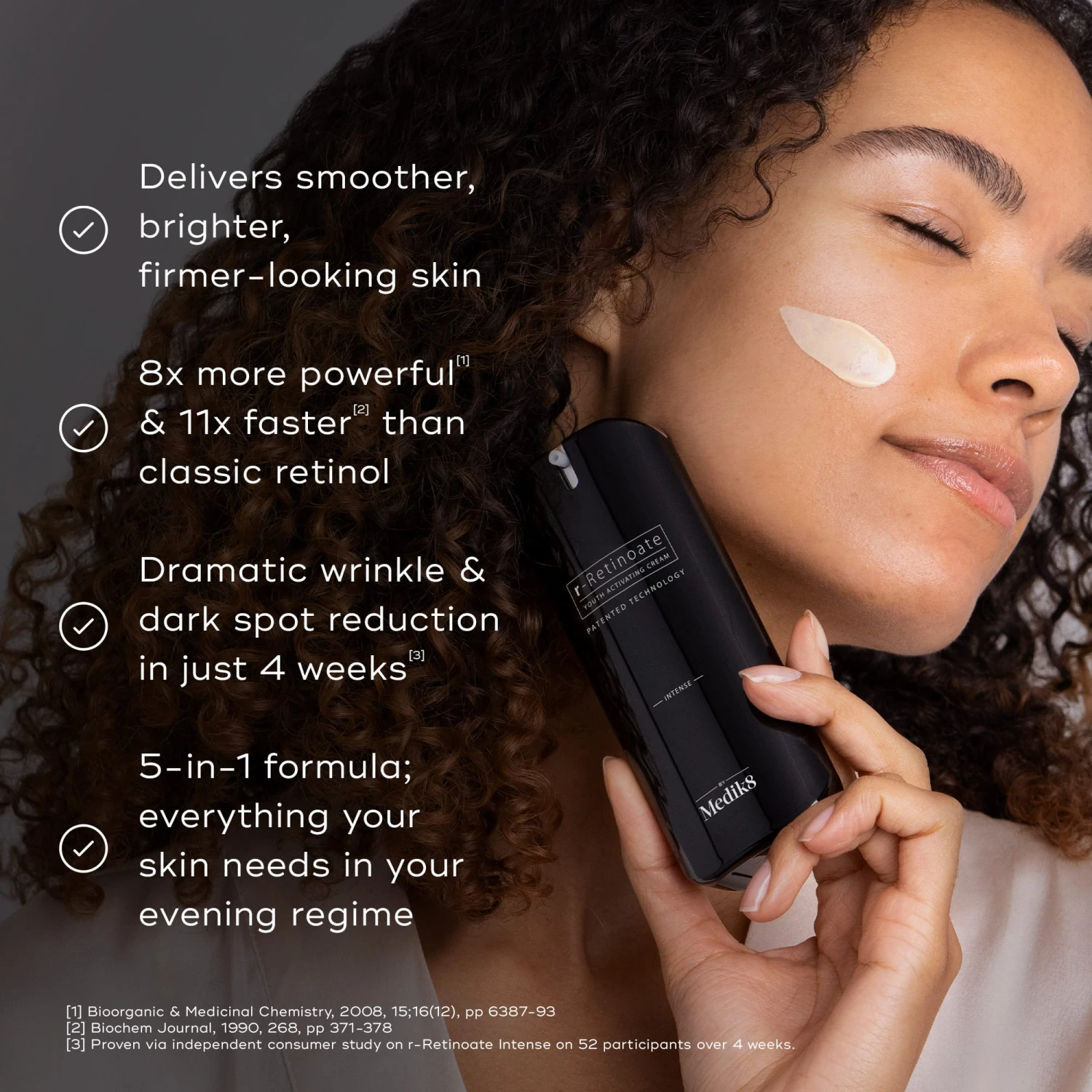 Setting new standards for age-defying excellence, r-Retinoate Intense is the jewel in the Medik8 Vitamin A crown. Proven to deliver noticeably firmer, smoother, brighter-looking skin, with dramatic wrinkle and dark spot reduction in as little as 4 weeks.* Also proven to be 8x stronger** and 11x faster^ than classic retinol, this innovative vitamin A formula is powered by a revolutionary blend of retinal and encapsulated retinyl retinoate (exclusive to Medik8).