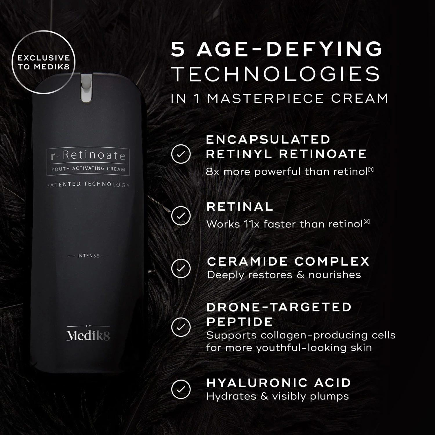 Combining 5 of Medik8’s most advanced age-defying technologies in 1 extraordinary nighttime cream, r-Retinoate Intense delivers everything your skin needs for astonishing youth-renewing results in one simple but luxurious step.